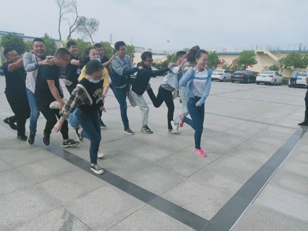 “投飛鏢”活動結束,大家意猶未盡,顧不上休息,馬上投入下一個團體項目單腳火車跑:7人排成一列,每人僅用右腳支撐。后一人右手搭前一人肩,左手托住前一人左腳,多隊并排一起站在起跑線上。裁判發令后各隊齊出,賽程為20米,用時少者為優勝隊,每次每個參賽隊至少有2名女隊員參加,比賽過程中腳掉下來的隊伍為犯規,將失去比賽資格。這是一個考驗團隊協作的項目,大家需步調一致才能順利快速前行。比賽過程中,姿態百出,前仰后合,笑料百出,趣味十足。能順利前行的隊幾乎沒有,均困難重重,甚至有幾個隊剛一出戰便有人跌倒,不氣餒,顧不上疼痛,迅速爬起來調整隊形再出發。最終財務部組隊贏得了冠軍。