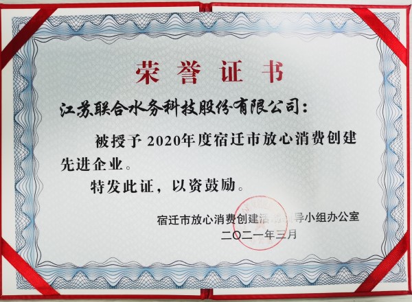 水是生命之源,與人類社會生產、生活息息相關。讓百姓用上放心水,是供水企業義不容辭的責任與社會擔當。江蘇聯合水務科技股份有限公司宿遷供水公司一直秉持“供優質之水服誠信之務”的經營宗旨,用心搭建用水放心消費通道,護衛城市生命線,共建和諧社會,在2020年度宿遷市放心消費創建中,榮獲“先進單位”表彰。