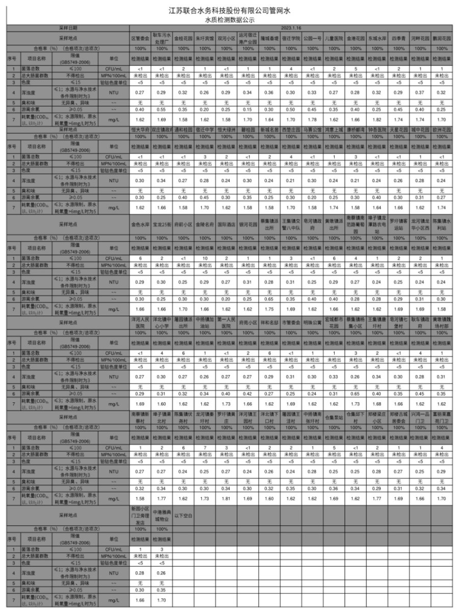 管網(wǎng)水半月公示(2023年1月下半月)