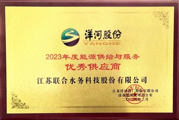 近期,江蘇洋河酒廠股份有限公司將印有“2023年度能源供給與服務優(yōu)秀供應商”的牌匾送到了江蘇聯(lián)合水務科技股份有限公司洋河區(qū)域供水服務中心,向公司一直以來為企業(yè)提供的安全穩(wěn)定供水和高效優(yōu)質服務表示衷心感謝。