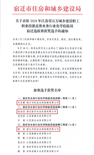 近日,江蘇省百萬城鄉建設職工職業技能競賽水務行業化學檢驗員決賽宿遷選拔賽順利舉辦,宿遷各縣區共26名選手參加,經過激烈角逐,公司3名參賽選手許蘇蒙、張浩浩、陳瑩在本次比賽中分別獲得一等獎、二等獎、三等獎,充分展示了公司水質檢驗方面的能力水平,接下來,她們將代表宿遷市參加省級競賽。