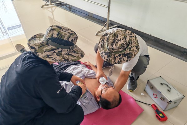 首先,演練團隊模擬作業人員在巡檢時突發中暑倒地,隨行人員發現后立即匯報應急小組組長,應急小組組長立即趕往現場并啟動應急預案。隨后,針對員工中暑情況,演練團隊及時啟動員工救援程序,救援人員迅速攜帶急救藥箱趕赴現場,對中暑員工進行緊急救治,并安全轉移到陰涼通風處平臥,及時給患者頭部捂上冷毛巾及擦拭酒精降溫,飲用清涼飲料及時補水,通過按壓穴位使患者蘇醒,并根據患者情況及時送醫治療。