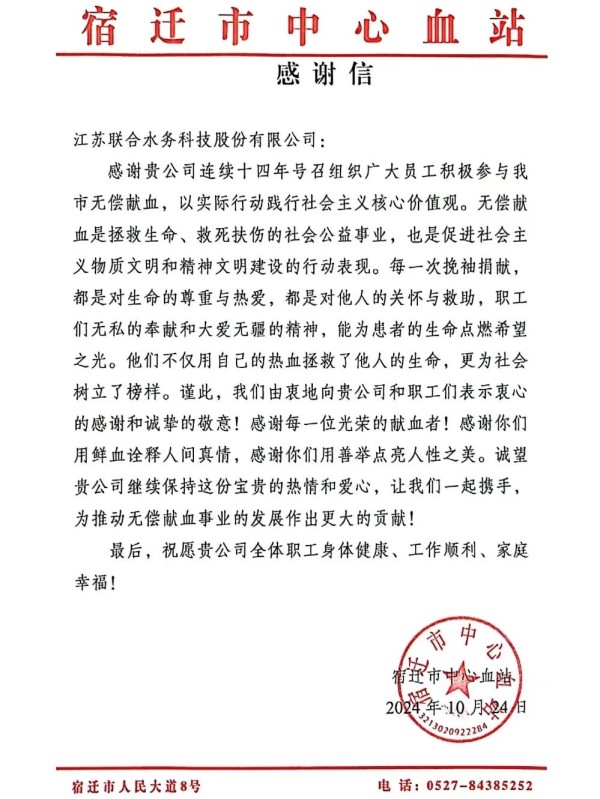 10月24日,江蘇聯合水務科技股份有限公司收到了來自江蘇省宿遷市中心血站的感謝信。信中對公司主動承擔社會責任、充分展現企業擔當和對無償獻血活動的大力支持表示感謝。這不僅是對公司獻血志愿者們無私奉獻的肯定,更是對聯合水務踐行社會責任、傳遞文明正能量的極高贊譽。