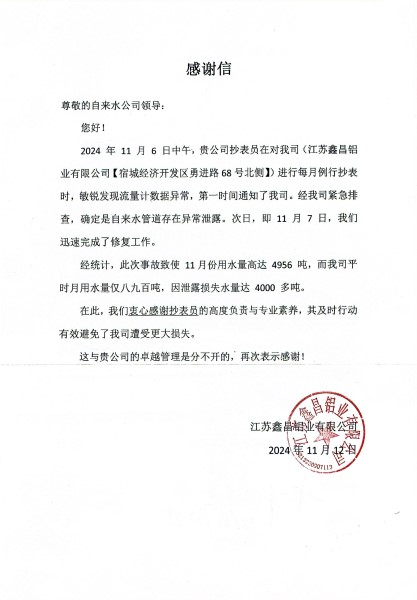 近日,江蘇聯合水務科技股份有限公司收到了一封來自江蘇鑫昌鋁業有限公司的感謝信。信中對公司工作人員高度負責的態度與專業高效的服務表示感謝,并贊揚了公司的卓越管理和優質服務。