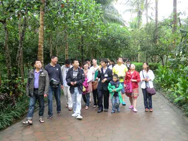 此次優(yōu)秀員工的海南行由總部布署,除了我們公司23人以外,還有桐鄉(xiāng)申和水務(wù)的3位同仁。一行26人在上海會齊后,浩浩蕩蕩登上飛機(jī),延路灑下歡聲笑語。首先在三小時的飛行中體驗10度至30度的氣溫變化,下了飛機(jī),再各自表演一段“脫衣秀”,海南之旅正式開始。