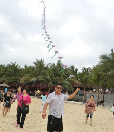 天涯海角曾經(jīng)來過,這次再來,只覺得身邊游人太多,頭頂來往的飛機(jī)太多,而且因是陰天,印象中寶石般的海水顏色不復(fù)得見,有些失望。走在海難上,一望無際,潮來潮往的海水一浪浪地漫過腳面,試著沙灘上寫些字,瞬間便被海水抹平,不由想入非非:如果心里也養(yǎng)上一灘海水多好啊,無論何種煩惱,只要把它寫出來,一個潮水便解決干凈。