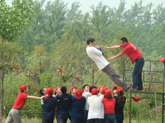 所以,我們十六個人在下面搭好“大床”后,會齊聲對上面的伙伴說:“我們準備好了,請相信我們!”。上面的隊員跳下來,穩穩地被接住,毫發不損。最無賴的是技術部胡經理,他覺得躺在大家臂彎里的感覺好極了,纏纏綿綿不愿離開,被大家硬掀了過去。