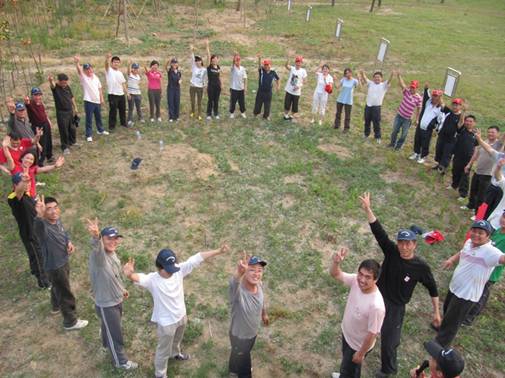 我們紅隊一致推選了高大、帥氣、能夠充分代表咱隊陽光形象的楊坤為隊長,隊名“龍之隊”。隊訓八個字:“龍隊給力、龍隊必勝!”隊歌是“團結就是力量,團結就是力量!嘢!!”之后,依次推選了郁莉為副隊長,柴總為安全員,駱莉為衛生員,陳潔為旗手。