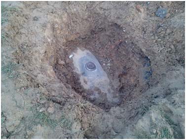 由于當(dāng)日幸福路上尚有兩處主管道正在搶修,人員很難調(diào)配,在得知這一信息后,稽查部參與現(xiàn)場(chǎng)處理的四名隊(duì)員主動(dòng)請(qǐng)纓參加夜戰(zhàn)搶修。最終,搶修按時(shí)進(jìn)行。值得慶幸的是,被損壞的漏點(diǎn)正好位于管道上方中間的位置(圖2),由于在沒(méi)有開(kāi)挖之前就做了幾套不同損壞點(diǎn)的搶修預(yù)案,因此,搶修進(jìn)行的比較順利,約凌晨三時(shí)左右就恢復(fù)了原水供給。