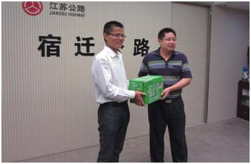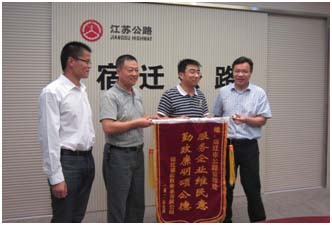 由宿遷銀控自來水有限公司投資1.33億元建設的洋河供水工程中,約20公里的DN800管線需沿省級公路鋪設, 9月10日,宿遷銀控自來水有限公司陳少軍副總經理帶隊慰問了宿遷市公路管理處,向他們贈送了“服務企業維民意,勤政廉明頌公德”錦旗,對他們大力支持洋河項目工程施工表示謝意,同時希望市公路管理處繼續對洋河供水工程予以關心、指導。