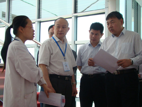圖3:陸桂華副廳長(右一)向工作人員詳細詢問水質檢測情況