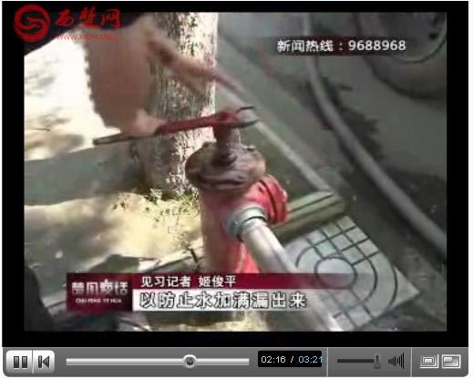 7月23日晚間,宿遷電視臺《楚風夜話》欄目以“灑水除塵 我為城市降‘火’”為題,報道了環(huán)衛(wèi)部門每天給城區(qū)主干道灑水降溫的新聞。視頻中,我們通過鏡頭發(fā)現(xiàn)了以下三個問題。第一是水車未在黃色消防栓上取水(如圖),第二是水帶和栓體及車體間的連接處漏水嚴重,第三是駕駛員在水箱注滿并溢出后,才關閉消防栓,沒有通過車輛外置的水位示管來控制。