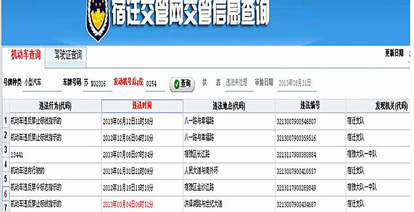 為了讓部門蘇N02316號皮卡車順利通過年審。830日,按人事行政部要求,稽查部通過宿遷市交管查詢系統對車輛有無違章行為進行了網上查詢。查詢結果顯示,從201211月至20137月間,共計有6起違章記錄。