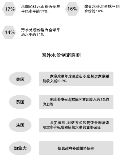 根據2008年國際水務情報機構(Global Water Intelligence)和經濟合作與發展組織(OECD)進行的全球水價調查結果來看:與全球平均水平相比中國的供水水價為世界平均的17%;污水處理價格為平均水平的14%;綜合水價為平均水價的16%。因此,我國的水價在全球范圍內處于較低水平。