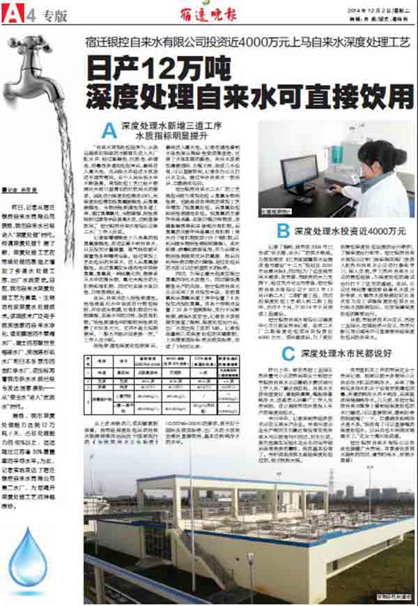 昨日上午,家住蘇宿工業園區蘇州壹號小區的鄭女士到宿遷市銀控自來水公司繳納水費時,好奇地問工作人員:“最近我發現,自來水水質明顯變好,看起來清爽,喝起來像純凈水,這是怎么回事?”工作人員告訴她,這正是我市花巨資投入生產出的深度處理水。