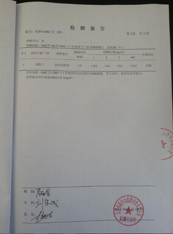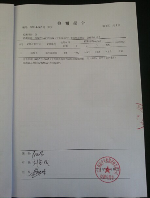 前不久,公司邀請第三方對一、二水廠的氯庫現場進行職業衛生檢測,主要是對現場氯氣濃度進行檢測。經過專業人員現場采樣,實驗后分析得出結論,一、二水廠現場氯氣濃度均小于0.2mg/m3,完全合格。也間接地驗證了公司在氯庫安全管理方面的成效。