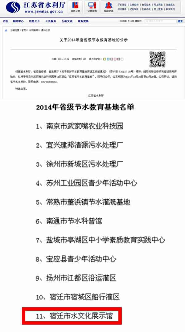 2014年12月24日,宿遷市水文化展示館以95分的高分順利通過“江蘇省節水教育基地”現場專家組評審后。2014年12月24日至29日,在省利水對2014年度省級節水教育基地結果在網站首頁進行為期五天的公示,在公示期內,無異議,宿遷市水文化展示館正式獲評“江蘇省節水教育基地”。