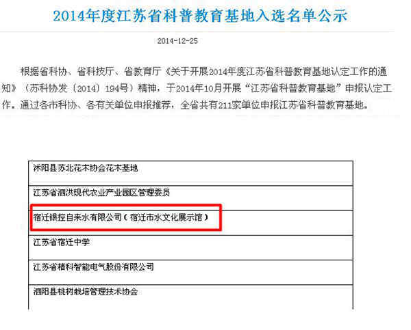 日前,從江蘇省科協官方網站中獲悉,宿遷市水文化展示館通過江蘇省教育廳、江蘇省科技廳、江蘇省科協共同組織的“江蘇省科普教育基地”評選,正式被授予“江蘇省科普教育基地”。這是繼2014年底獲得“江蘇省節水教育基地”后,宿遷市水文化展示館又一次獲得的省級榮譽稱號。