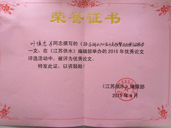 在此次優秀論文評選中,宿遷銀控自來水有限公司水質檢測中心經理葉慎忠撰寫的“駱馬湖水PH升高預警及處理方法探討”被評選為優秀論文。
