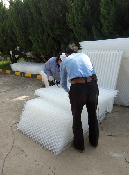 經過1個多月的前期準備,一水廠2.5萬噸系統沉淀池斜管和支架更換工作如期開展。由于2.5萬噸系統沉淀池斜管和支架使用時間較長尤其是底部的支架,已出現老化和銹蝕現象,隨著高峰供水的到來,系統負荷加大,對斜管和支架的沖擊增加。為保障供水安全,按2015年計劃,按期開展更換工作。