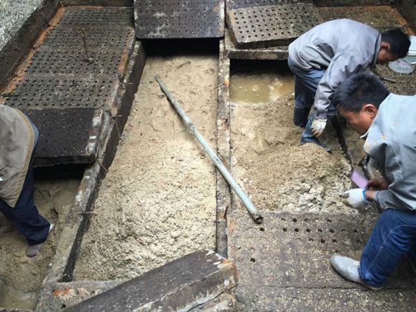 (圖2:清理過水區濾料、疏通濾板過水孔)
