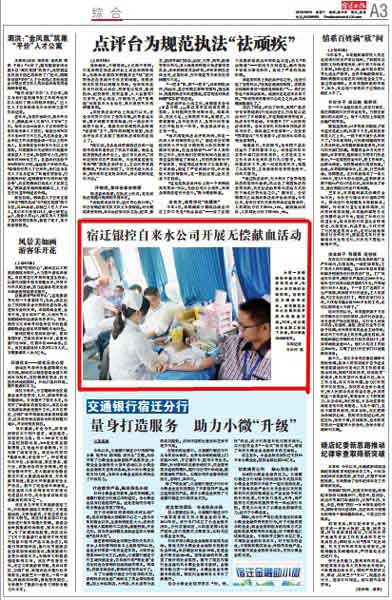 宿遷公司弘揚水潤萬物的奉獻精神,多年來,一直堅持積極履行社會責任,每年均多次組織有意義的公益活動,“無償獻血”作為一項重要的公益事業已經連續進行6年,而且每當血庫庫存告急之際我們都會及時伸出援助之手,為打造宿遷文明建設注入更多力量,也展現展現了我公司熱情、奉獻、和諧的良好企業形象。
