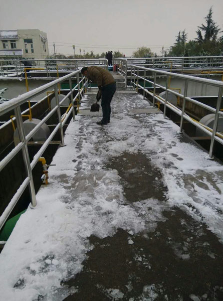 11月25日夜間,2015年冬天的第一場大雪突然來襲,短短2、3個小時的時間廠區便銀裝素裹到處一片白茫茫,雖然雪景好看,但給我們的制水生產帶來了諸多的不便和安全隱患,公司領導也十分關心生產安全多次電話提醒加強安全生產和防凍工作。制水部隨即緊急通知各分部的員工加強安全巡視工作,避免出現滑倒和摔傷,做好防凍設施的檢查工作。