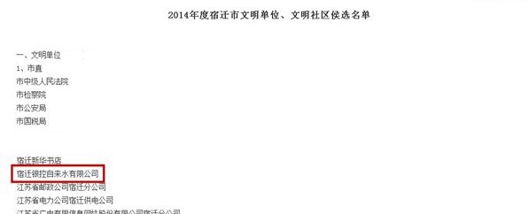 進行公示,宿遷銀控自來水有限公司上榜,近日,市文明辦將提請宿遷市委市政府對受表彰單位予以通報。