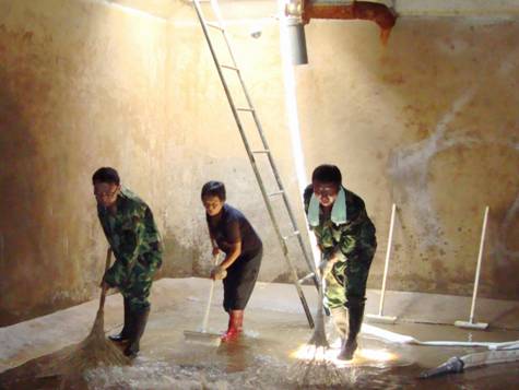 為了不影響宿遷學院的正常用水,必須在一天完成兩組蓄水池體消毒和清洗工作,這需要消毒服務小組每個人的相互配合,緊密銜接。所以,服務小組的領隊顧全局特別強調了工作紀律和作風,要求小組成員在工作中一定要展現出銀控人認真敬業的精神面貌。在領隊的調度下,大家各負其責,緊鑼密鼓地開始工作,先排空池水,然后進入池內進行徹底清洗。外部36℃高溫下,池內更像大蒸籠,每個人都汗流如雨,洗刷結束后,再使用“消毒專用液”進行全面消毒,晚上8點鐘才完成兩組蓄水池體的清洗消毒并順利通過驗收。