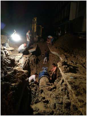 工程管理部接到施工通知后,即刻開始相關施工方面的組織,成立項目小組。浦東路為老舊道路,周邊管線復雜,施工場地狹小,施工難度大。項目小組對管道周邊范圍內的管線及構筑物進行排查,制定施工方案,調派強有力的施工班組,組織機械、材料進場。施工期間正值高溫酷暑天氣,施工人員不畏酷暑,合理安排施工工序及作息時間,加班加點爭取盡早實現管道通水。