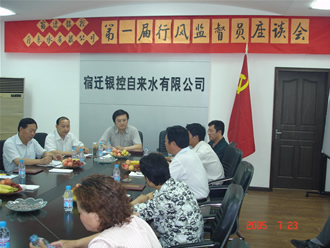 2005年7月23日下午,宿遷銀控自來水有限公司第一次行風監督員座談會在公司會議室召開。會上八位監督員對宿遷銀控自來水有限公司改制后的行風建設工作所取得的成績進行了肯定,并對該公司的行風建設提出了一些寶貴的意見和建議。