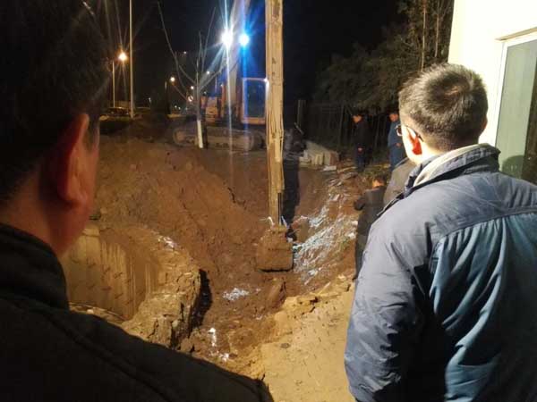 本周,接到客服大廳電話,蘇宿園區普陀山大道附近一施工單位將我自來水公司DN400主管道損壞。接到消息后,稽查部王經理立刻帶領稽查人員趕赴現場。在稽查人員到達現場后不久,公司副總經理尹總也到達現場,并開始指揮調度。雖然當時已經是接近深夜,溫度很低,但是大家的熱情都很高漲,在現場稽查部和管網部的通力協作下,在凌晨時分終于將管道維修完畢。