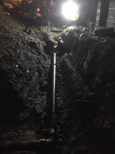 為了減少對(duì)市民正常生活的影響,工程部放棄了周末休息,加班加點(diǎn)進(jìn)行管道的遷移,又逢周末下雨,幸好是小雨,在做好防護(hù)措施后,施工人員堅(jiān)持冒雨施工,施工人員身著雨衣踩著濕滑的泥地,伴著雨聲一根一根地安裝著球墨鑄鐵管;同時(shí),在防護(hù)嚴(yán)密的雨棚底下,焊工也在不停地焊接著鋼管。