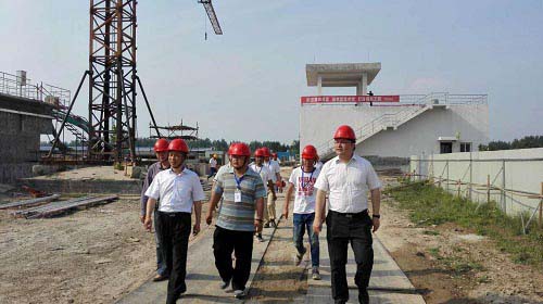 劉總抵達(dá)宿遷后不顧舟車勞頓,直接前往宿遷公司目前在建工程項(xiàng)目施工現(xiàn)場進(jìn)行實(shí)地督導(dǎo)。公司目前主要在建工程項(xiàng)目有二水廠三期工程、河湖連通工程和DN1400主管道建設(shè)工程。在二水廠三期項(xiàng)目現(xiàn)場,公司總經(jīng)理曾真向劉猛副總裁匯報(bào)了宿遷公司目前供水形勢及項(xiàng)目建設(shè)情況。三期擴(kuò)建項(xiàng)目土建主體已施工完成,工藝設(shè)備安裝正在有序進(jìn)行,廠區(qū)工藝管線施工已完成80%。區(qū)域供水項(xiàng)目部嚴(yán)格按照要求排定趕工計(jì)劃、安排值班表,督促施工單位按照計(jì)劃施工,加班加點(diǎn)爭取按照目標(biāo)工期完成建設(shè)任務(wù)。目前,全市即將進(jìn)入高峰供水階段,三期工程早日完工投產(chǎn)能夠帶來充足的水量補(bǔ)充,從而有效緩解高峰供水壓力,所以項(xiàng)目建設(shè)工作的重中之重是按照既定計(jì)劃,在保障施工安全的前提下按期完成。河湖連通工程目前已全部完成泵站廠區(qū)內(nèi)的主體建設(shè),設(shè)備安裝工作正在緊張進(jìn)行。DN1400主管道總體工程施工進(jìn)度已完成70%,主體洪澤湖路至陽澄湖路段已通水,目前尚有古黃河沉管與姑蘇路至蘇州路以南未能施工,相關(guān)報(bào)批手續(xù)及用地房屋拆遷工作正在加緊進(jìn)行中。