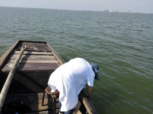 (圖1:水質監測人員正在取水樣)