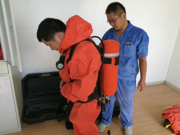 本次督查主要檢查員工用B級防化服和正壓式空氣呼吸器的佩戴和使用,一方面考察員工是否會正確佩戴及使用應急物品,另一方面考驗員工在緊急情況下能否迅速佩戴好個人防護用品。正確佩戴正壓式空氣呼吸器主要包括檢查、佩戴、調整、確認時間等環節,考察員工對空氣呼吸器佩戴裝置、氣瓶壓力、報警閥、面罩及呼吸閥的檢查,對呼吸器佩戴操作的熟練度和連貫性。