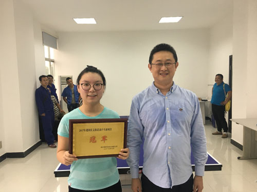 29日下午,在二廠活動室舉行乒乓球比賽。初賽階段,所有選手抽簽分組,進行32勝淘汰賽。“高手”之間的較量更有看頭,賽場上陣陣歡呼,高潮不斷,你來我往,扣殺還擊,小球轉(zhuǎn)動大智慧,拼體力更要有腦力,賽場上多次上演峰回路轉(zhuǎn),反敗為勝的場面。重重廝殺后,決出四強,分別是機電部的程堯、水檢公司的王藝錦、制水部的尚旭東以及公司領(lǐng)導(dǎo)尹總。半決賽以及決賽采用53勝制,其中,尹總和王藝錦的半決賽之爭最為吸引人的眼球,雙方比分一直緊咬,最后關(guān)頭,王藝錦主動攻球,最終以3:1獲勝,四局的比分分別為13:1110:1213:1113:11。進入決賽的王藝錦球感爆棚,又擊敗尚旭東,摘得乒乓球比賽的冠軍。