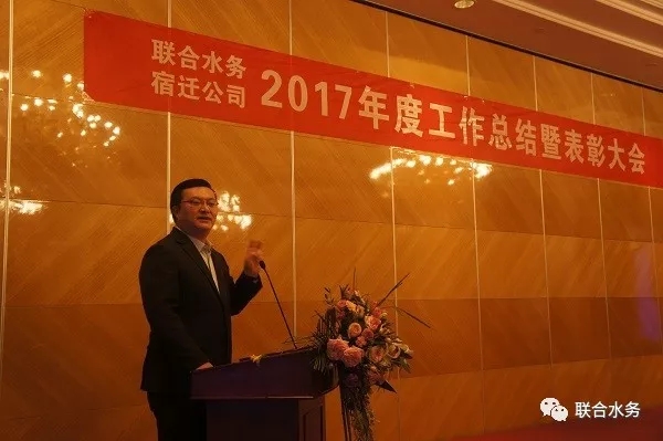 最后,聯合水務集團供水業務副總裁劉猛先生做重要講話。劉總裁高興地說近期可謂喜事臨門,今年的集團年會選在宿遷隆重召開,充分說明了集團公司對宿遷項目的信任與重視。劉總裁就目前的經營業績,對宿遷項目近年來所取得的成績以及腳踏實地、務真務實的工作作風給予了充分肯定。接下來,劉總裁介紹了聯合水務集團2017年運營情況,各項任務指標完成良好,新項目拓展勢頭良好,集團隊伍不斷壯大。最后,劉總裁說,宿遷項目作為集團公司的第一個供水項目,在發展壯大過程中勇于擔當、開拓創新,塑造了積極向上的企業精神,值得贊賞。他對宿遷公司2018年發展提出了五點希望與要求:一是,繼續發揚攻堅克難的精神,保質保量做好各項供水工作;二是,宿遷聯合市政工程公司真抓實干,加快自身建設,積極穩妥推進各項工程建設,創收增效;三是,進一步提升運營管理水平,精益求精,制定智慧水務發展戰略,加快智慧化水務建設進程;四是,整個宿遷項目是一體的,供水項目要更加關心支持污水項目的經營發展,齊頭并進,共創佳績;五是,希望全體人員團結一心,共同奮斗,圓滿完成集團下達的各項任務目標。