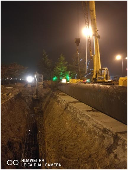DN1400給水主管道工程施工難度對我們來說也是一次不小的考驗,經統計DN1400管道共穿越了古黃河、順堤河、清水河、民便河4條河道,穿越了洪澤湖路、青海湖路、陽澄湖路、徐淮路、通湖大道等17條道路,其中5次穿越省級公路。每一次穿越河道或道路施工都會遇到了諸多難以想象的困難,如過河施工,需考慮汛期、管道在水中的穩定性、河道景觀和水質的保護等;再如穿越道路施工,需考慮交通導流、夜間施工、文明措施、避讓其他管線等。我們一條河一條河的穿越、一條路一條路的穿越、一個施工方案一個施工方案的制定和執行、一個問題一個問題去解決……最終保證了DN1400管道的順利貫通。