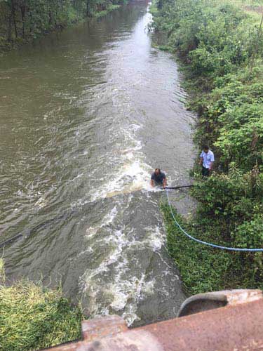 2018628日上午9時左右,龍河區域供水服務中心營業廳接到夏圩村客戶來電反映整個村中無自來水使用。隨后,服務受理員通知維修員趕赴現場排查原因。維修員經過近1個小時地毯式的排查后,終于在陸圩橋下河內發現疑似漏點。