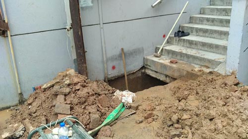 75日早,我接到市府東路有一處漏點的信息。趕到現(xiàn)場后,發(fā)現(xiàn)漏點位于整澆的樓梯下,無法對整澆的樓梯結構進行切割砸除,維修起來就更加困難。由于漏點位置處于房屋外墻樓梯坡道下,只能人工開挖。經過馬不停蹄一中午的大干,在地面上挖了個大坑后終于挖到漏點。在一處50口徑的鐵管上發(fā)現(xiàn)有大拇指般大小的漏洞正在往外漏水。見此情況維修員也顧不上停下來休息,轉身拿了維修配件又鉆到了坑里開始維修。炎熱的空氣狹小的維修空間讓維修員的呼吸變得沉重,不一會便汗流浹背。約半個小時后,從坑里上來的維修員長長的舒了一口氣:“終于把漏點維修好了”。