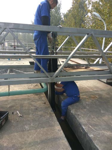 運行人員發現問題,立即聯系相關部門,機電設備部現場勘查后發現水泵轉動無問題,基本確定為水泵或管道堵塞,但是水泵管道太重無法拉出。機電部人員沒有放棄,創造條件利用手動滑輪將水泵和管道吊了出來。最后確認是管道口堵塞了,清理之后,故障排除。桁車式吸沙機運行正常。此次維修我們看到機電部人員面對維修困難,沒有固守成規,大膽創造,保證污水廠的設備運行正常,保證了出廠水質。