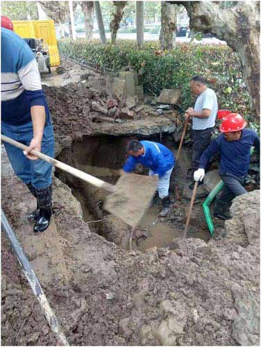 隨后丁經(jīng)理出門行至四號(hào)橋底口腔醫(yī)院門口發(fā)現(xiàn)路面有大量積水,路邊有噴水口。因爆裂管道位于路邊綠化帶下,大量自來水漏出的同時(shí)將綠化帶中的泥土噴濺到路面,丁經(jīng)理首先安排工作人員關(guān)閉管道閥門,減免不必要水量流失,隨后對(duì)路面進(jìn)行簡單清掃以便減少對(duì)上班早高峰人群的影響。由于爆管處管網(wǎng)復(fù)雜無法使用挖機(jī)進(jìn)行開挖,只得人工開挖,但這在搶修管道上又增加時(shí)耗。為了降低沿線用水客戶的不便,公司安排水車對(duì)無水小區(qū)進(jìn)行送水。經(jīng)過7、8個(gè)小時(shí)的人工開挖終于在下午2點(diǎn)左右挖到漏點(diǎn),是DN300的水泥管道斷裂。維修工迅速領(lǐng)取維修材料進(jìn)行維修,于下午5點(diǎn)將管道連接上,又經(jīng)過一個(gè)小時(shí)的管道銜結(jié)處晾干后,立刻開閥進(jìn)行排水工作,終于在晚上10點(diǎn)左右恢復(fù)沿線小區(qū)的供水。