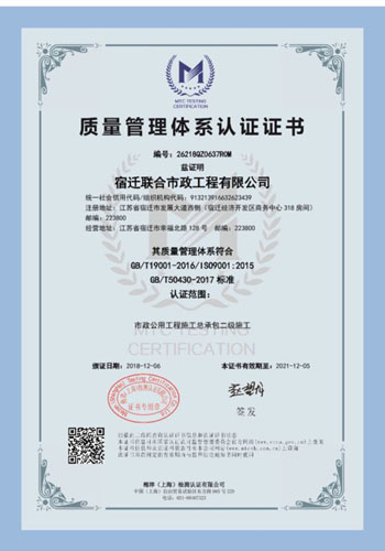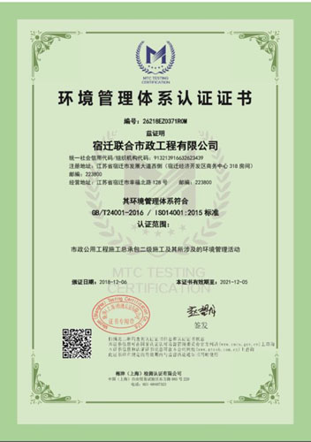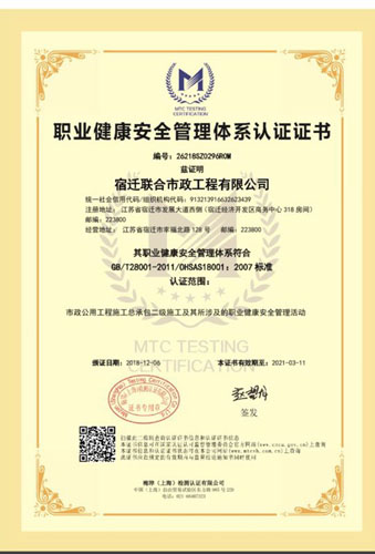 2018126日,經過近一年的不懈努力,宿遷聯合市政工程有限公司終于迎來了“ISO9001質量管理體系”、“ISO14001環境管理體系”、“OHSAS18001職業健康安全管理體系三大體系認證的最終勝利。