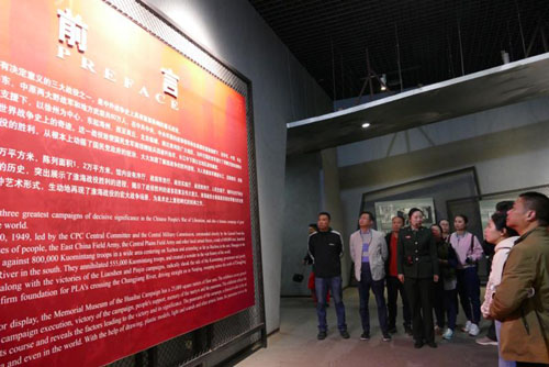 帶著無比欽佩之情離開馬莊村,黨員們來到學習活動的第二站——淮海戰役紀念館。1959年,為了紀念解放戰爭時期三大戰役之一的淮海戰役(1948.11.6~1949.1.10)的偉大勝利,弘揚老一輩革命家的豐功偉績和英雄們的革命精神,國務院決定興建淮海戰役紀念塔,1965年建成,2007年,新館落成,建筑面積3950平方米,館內陳列面積2800平米,陳列分前廳、序言廳、戰役廳、支前廳、烈士廳、后廳六部分,共展出珍貴文物、歷史照片以及油畫、國畫、雕塑等2200余件,包括毛澤東同志為中央軍委起草的《關于淮海戰役作戰方針》的電報手稿,淮海戰役總前委指揮作戰用的電臺,韓聯生等86名烈士的遺像,遺物等。作為全國紅色旅游經典景區之一, 每年來緬懷先烈的社會各界團體、個人絡繹不絕。