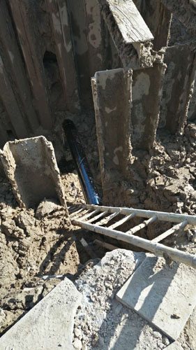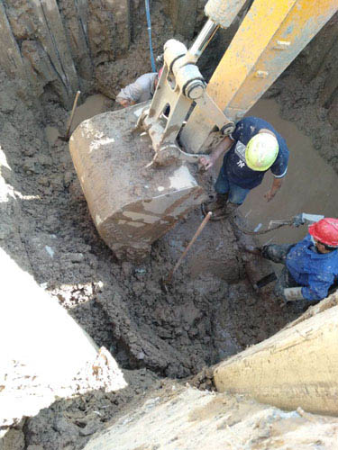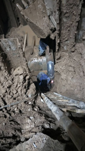 在做好各項準備工作之后,晚上23點半,正式開始維修開挖。開挖過程中,由于積水較多,搶修人員不得不一邊開挖一邊排水,加之管道埋深高達6米多,不停造成塌方。維修人員沉著應戰,直至第二天早上9時30分才將被頂壞的供水管道挖出來。經檢查,漏點為DN300鋼管,大小為30*20公分。由于管道旁邊就是雨污水管道施工的盾構機,維修地點情況比較復雜,經現場搶修人員商定暫將破損管道兩側加設盲板,封堵漏水,暫時保證南北兩側的正常供水,之后再行細化搶修方案。