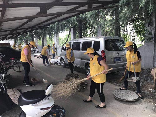 一大早,身著黃色志愿者服裝的銀控志愿者服務(wù)隊成員們就聚集在一起,風(fēng)風(fēng)火火開展衛(wèi)生大清活動。志愿者們分成三個小分隊,分別對公共區(qū)域,居民家中衛(wèi)生死角以及停車棚進(jìn)行掃除和整理。天氣悶熱,但志愿者們不怕臟、不怕累,揮舞著掃帚和毛巾認(rèn)真的打掃每塊區(qū)域,不放過任何死角。一會的功夫大家已經(jīng)汗流浹背,來往的居民看到我們辛勤的打掃,紛紛對我們表示贊揚。