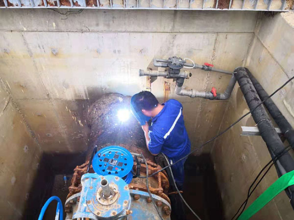 近日,機電部人員巡視時發現二水廠三期加氯口法蘭盤底部焊接處漏水,初步判斷管道受到腐蝕導致,這給加氯消毒帶來一定影響。由于加氯口管道低于清水池液位,所以不能立即維修,必須等到清水池液位低于管道口才可以進行維修,宿遷公司有一二三期清水池,之間管道是相互連接,對管道維修有一定影響。經與制水部商議,將三期與一二期出水管道連接閥門關閉,對一二期清水池高位蓄水,三期清水池液位保持低于加氯管道高度。維修人員立即進行管道測量,確定所需配件型號及數量,維修人員對材料進行初步粘接,然后用最短時間進行安裝,保障安全供水。