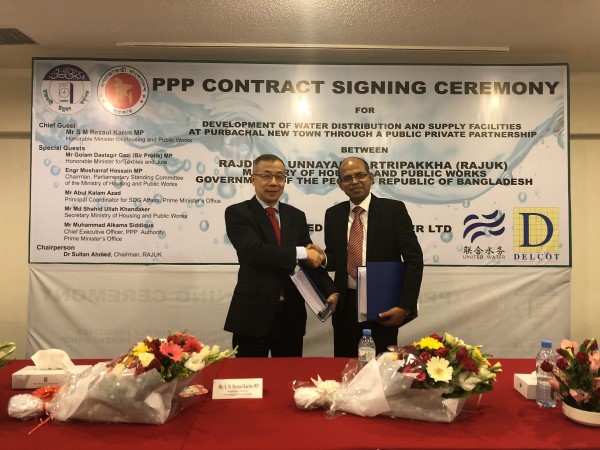 20191111日,孟加拉國(guó)第一個(gè)供水PPP項(xiàng)目—孟加拉國(guó)首都達(dá)卡市Purbachal新城供水及配水設(shè)施開發(fā)PPP項(xiàng)目簽約儀式在達(dá)卡市隆重舉行。該項(xiàng)目由聯(lián)合水務(wù)集團(tuán)與孟加拉Delcot集團(tuán)聯(lián)合投資建設(shè)并運(yùn)營(yíng),設(shè)計(jì)供水能力為34萬噸/日,將為Purbachal新城24平方公里內(nèi)的160萬居民提供優(yōu)質(zhì)供水服務(wù),特許經(jīng)營(yíng)期限為15年。