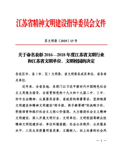 近日,江蘇省精神文明建設指導委員會發文表彰“2016-2018年度江蘇省文明單位”,宿遷銀控自來水有限公司榮膺在列,這是宿遷銀控繼2010-2012年、2013—2015年獲得“江蘇省文明單位”后,第三度蟬聯此項殊榮,充分展現了公司勇擔社會責任、弘揚時代新風的良好企業形象。